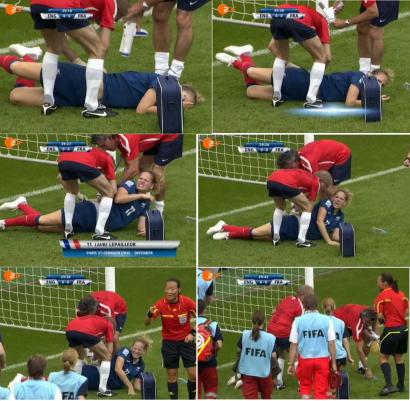 Aber zurück zum Thema: was war passiert? Wir schreiben die 39. Minute, eine Französin geht nach einem Eckball die englische Torhüterin an und landet unsanft am Pfosten. Dann kommt der große Auftritt vom französischen Betreuer - docteur anus.